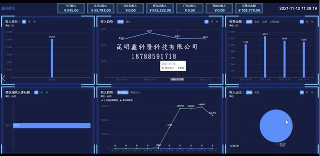 ?通過設(shè)備對道路泊位的信息采集,形成財務(wù)數(shù)據(jù)分析,在平臺呈現(xiàn)停車位的經(jīng)營情況,如下圖停車場的收入情況,通過柱狀圖、折線圖、餅圖三個不同類型的方式展現(xiàn),從排行、趨勢、占比多角度直觀地分析。